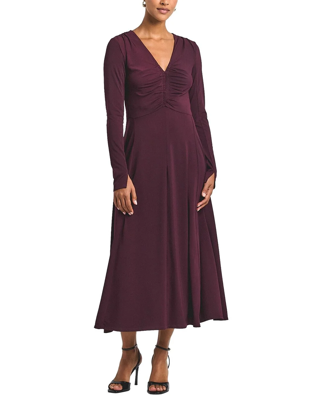- Guaranteed for Easter. Delivery restrictions apply. - See disclaimer. - About the brand: A relaxed, sensible approach to style with a touch of intelligence and unique charm. - Isabella Ruched Front Long Sleeve Dress in black cherry - Approximately 49in from shoulder to hem - Measurements taken from a size S and may vary slightly by size. - 95% polyester, 5%elastine - Dry clean only - Imported