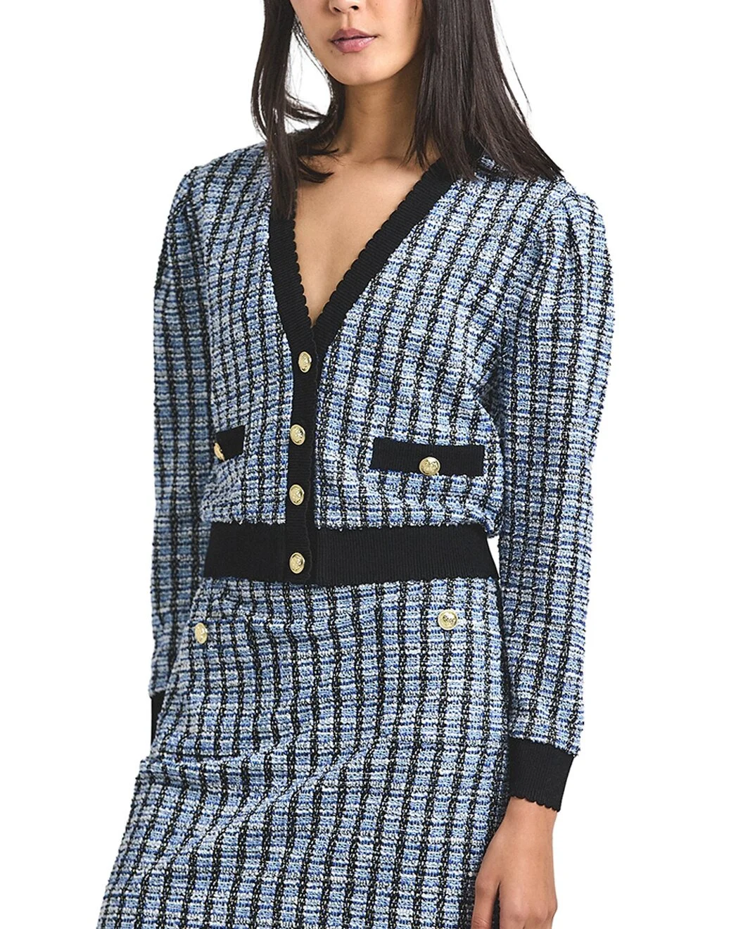 - About the brand: A relaxed, sensible approach to style with a touch of intelligence and unique charm. - Ky Stretch Tweed Cardigan Jacket in blue multicolor - Approximately 20-19.5in from shoulder to hem - Measurements taken from a size S and may vary slightly by size. - 80% polyester, 17% cotton, 2% lurex, 1% spandex - Dry clean only - Imported