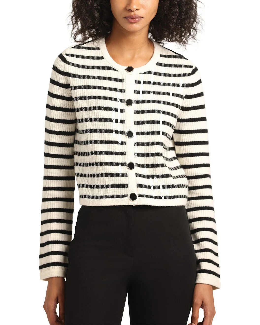 - About the brand: A relaxed, sensible approach to style with a touch of intelligence and unique charm. - Nebula Sequin Wool-Blend Cardigan in blanc de blanc//black - Approximately 18.75in from shoulder to hem - Measurements taken from a size S and may vary slightly by size. - 80% wool20% nylon - Dry clean only - Imported