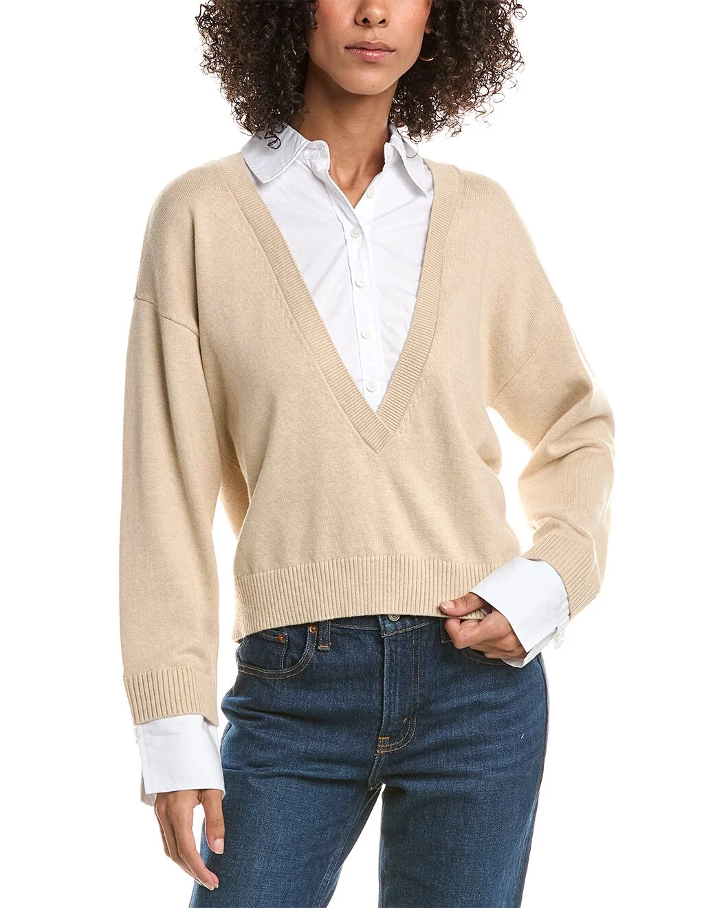 - About the brand: A relaxed, sensible approach to style with a touch of intelligence and unique charm. - Rida Mixed Media Sweater in safari and white with twofer design, deep V-neck, and dropped-shoulders - Approximately 21in from shoulder to hem - This item tends to run small (based on Member feedback). We recommend sizing up for your best fit. Model is 5'10 and is wearing a size small. Measurements may vary slightly by size. - 95% Cotton, 5% Cashmere - Dry clean only - Imported