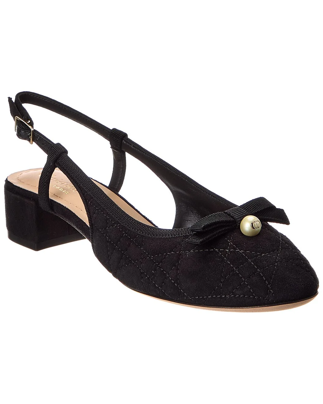 - About the brand: Elegant and timeless French luxury. - Please note: Size selections are European. For US conversions, please reference size chart. - Made in Italy - Ballet Quilted Suede Slingback Pump in black quilted suede and gold-tone hardware with grosgrain trim, bow accent and logo pearl - Adjustable ankle strap with buckle closure - Lightly padded leather insole - Smooth leather sole - 1.5in heel - Please note: All measurements are approximate and were taken from a size 37; slight variations may occur. - Our products are 100% genuine. In some cases we purchase merchandise from trusted independent suppliers and not directly from the brand owner. In all cases we stand by the authenticity of every product sold on our site.