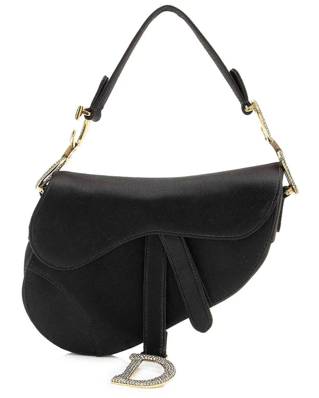 - About the brand: Elegant and timeless French luxury. - This is an authentic, pre-loved piece. This item is in very good condition and shows light signs of wear. This item shows scuffs and light pulls throughout exterior. light creasing and wear throughout handle. surface scratches to hardware. minor marks to interior. - For more information on condition, please see our condition guide at the bottom - Saddle Mini Bag in Black Crystal & Satin with black satin lining and gold-tone hardware - Pockets: one exterior - Measurements: 8.5in long x 1.5in wide x 6in high; 5in handle - Please note: All measurements were taken by hand and are approximate; slight variations may occur. - Accompanied by dust bag - Magnetic closure - The Pre-Loved Condition Guide - Our products are 100% genuine. In some cases we purchase merchandise from trusted independent suppliers and not directly from the brand owner. In all cases we stand by the authenticity of every product sold on our site.