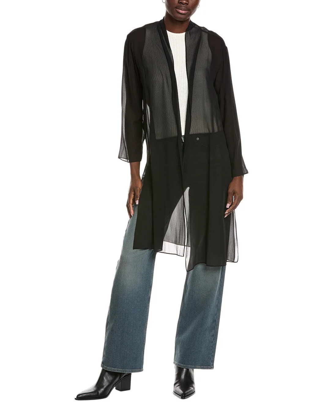 - About the brand: Versatile minimalist shapes, ethically made. - High Collar Silk Jacket in black with sheer fabrication and side slits at hem - Approximately 40in from shoulder to hem - This item tends to run large (based on Member feedback). We recommend sizing down for your best fit. Model is 5'9 and is wearing a size x-small. Measurements may vary slightly by size. - Open front - 100% silk - Machine wash - Imported