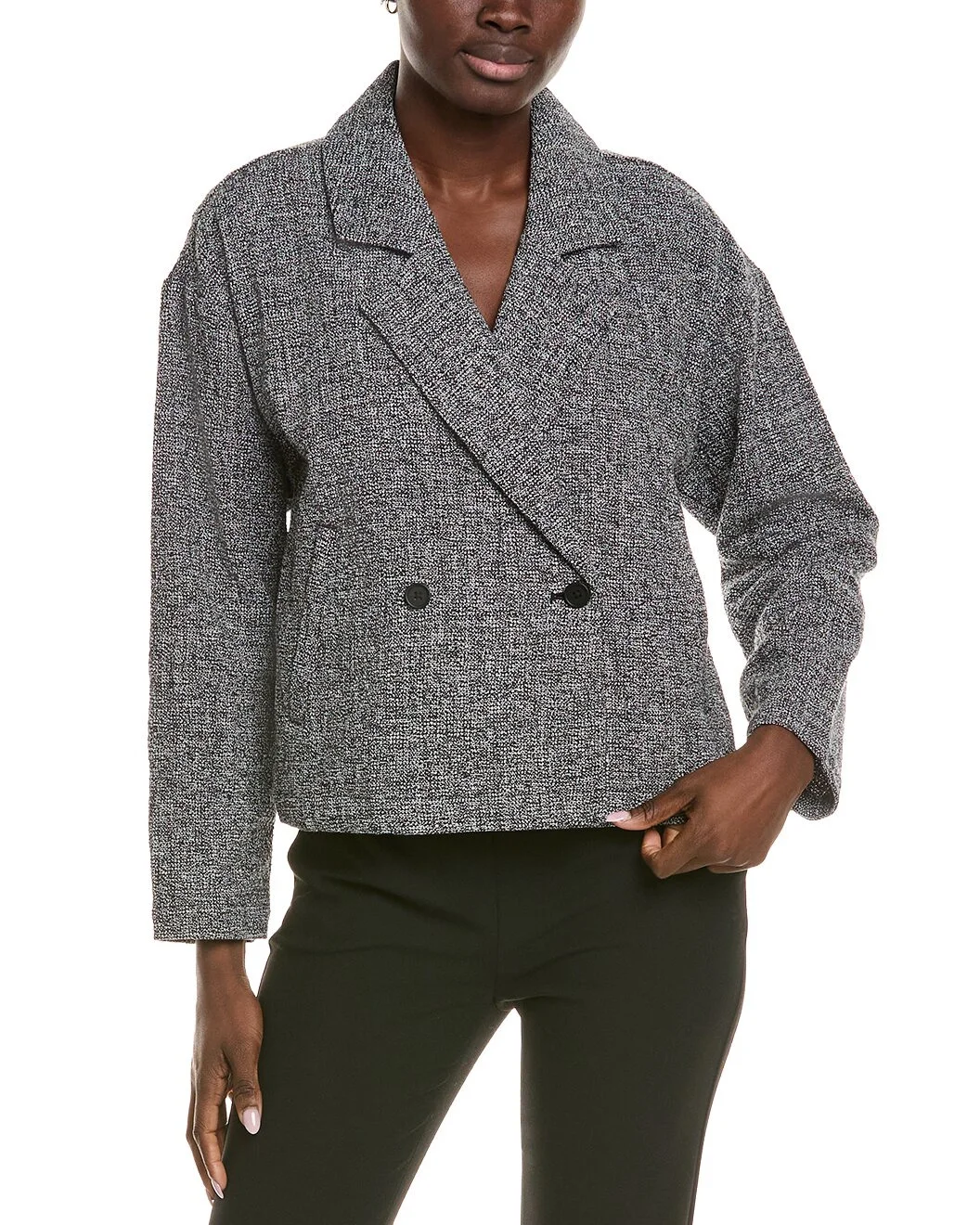 - About the brand: Versatile minimalist shapes, ethically made. - Short Blazer in black and white with welt pockets - Approximately 23in from shoulder to hem - This item tends to run large (based on Member feedback). We recommend sizing down for your best fit. Model is 5'10 and is wearing a size S. Measurements may vary slightly by size. - Double-breasted button closure - 99% Organic Cotton, 1% Elastane - Dry clean only - Imported