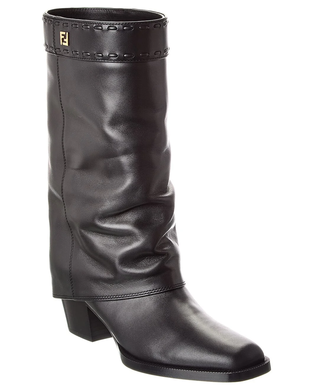 - About the brand: Innovative and elegant Italian luxury. - Please note: Size selections are European. For US conversions, please reference size chart. - Made in Italy - FF Leather Boot in black leather and gold-tone hardware with fold-over cuff and logo accent - Lightly padded leather insole - Smooth leather sole - 2.5in heel - 10in shaft - 14in boot circumference - Please note: All measurements are approximate and were taken from a size 37; slight variations may occur. - The Boot Size Guide - Our products are 100% genuine. In some cases we purchase merchandise from trusted independent suppliers and not directly from the brand owner. In all cases we stand by the authenticity of every product sold on our site.