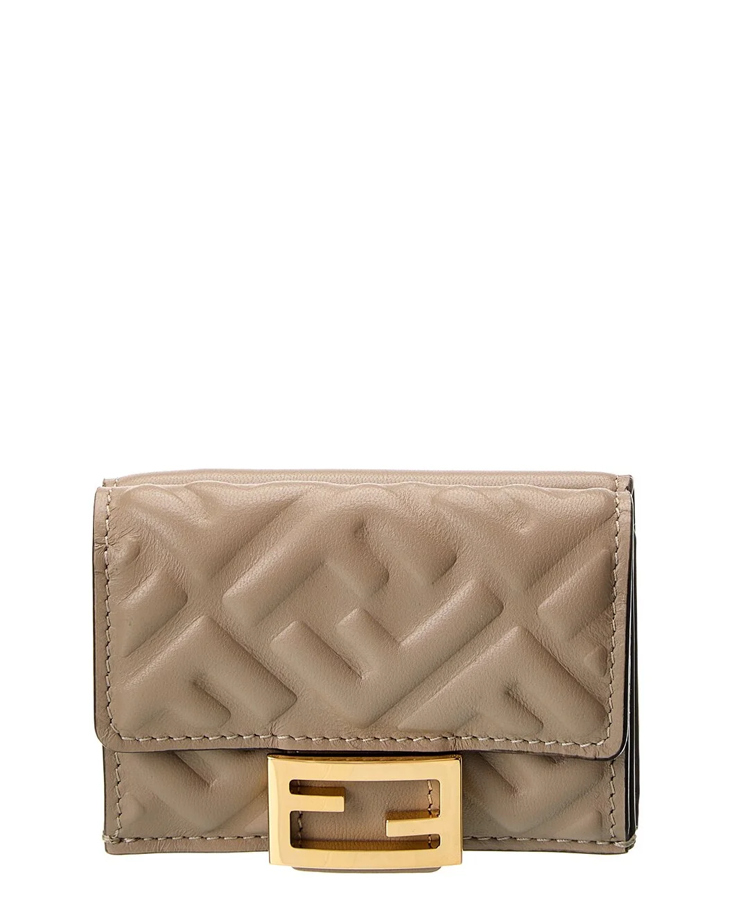 - About the brand: Innovative and elegant Italian luxury. - Made in Italy - Micro Trifold Leather Wallet in beige FF embossed leather with gold-tone hardware - Interior design details: leather and fabric lining, interior pocket, bill compartment - Measures 3.7in wide x 2.5in high x 1.5in deep - Fold-over flap with snap closure - Please note: All measurements were taken by hand and are approximate; slight variations may occur. - Our products are 100% genuine. In some cases we purchase merchandise from trusted independent suppliers and not directly from the brand owner. In all cases we stand by the authenticity of every product sold on our site.