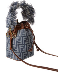 - About the brand: Innovative and elegant Italian luxury. - Made in Italy - Mon Tresor Mini FF Denim Leather Hobo Bag in blue denim-effect FF jacquard fabric and brown leather with gold-tone hardware and fringed handle - Interior design details: one main compartment - Measures 5.5in wide x 7in high x 4.75in deep - Top handle drops 4.75in - Removable shoulder strap drops 22.25in - Drawstring closure - Please note: All measurements were taken by hand and are approximate; slight variations may occur. - Our products are 100% genuine. In some cases we purchase merchandise from trusted independent suppliers and not directly from the brand owner. In all cases we stand by the authenticity of every product sold on our site.