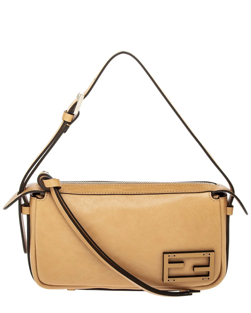 - About the brand: Innovative and elegant Italian luxury. - Made in Italy - Simply FENDI Mini Leather Shoulder Bag in beige leather and silver-tone hardware; inspired by a 1990s archive style, low-sheen finish calfskin, long calfskin zipper-pull with knot, FF embellishment - Interior design details: one main compartment - Measures 8.7in wide x 5.1in high x 1.8in deep - Adjustable shoulder strap drops 13.5in - Zipper closure - Protective feet at bottom - Please note: All measurements were taken by hand and are approximate; slight variations may occur. - Our products are 100% genuine. In some cases we purchase merchandise from trusted independent suppliers and not directly from the brand owner. In all cases we stand by the authenticity of every product sold on our site.