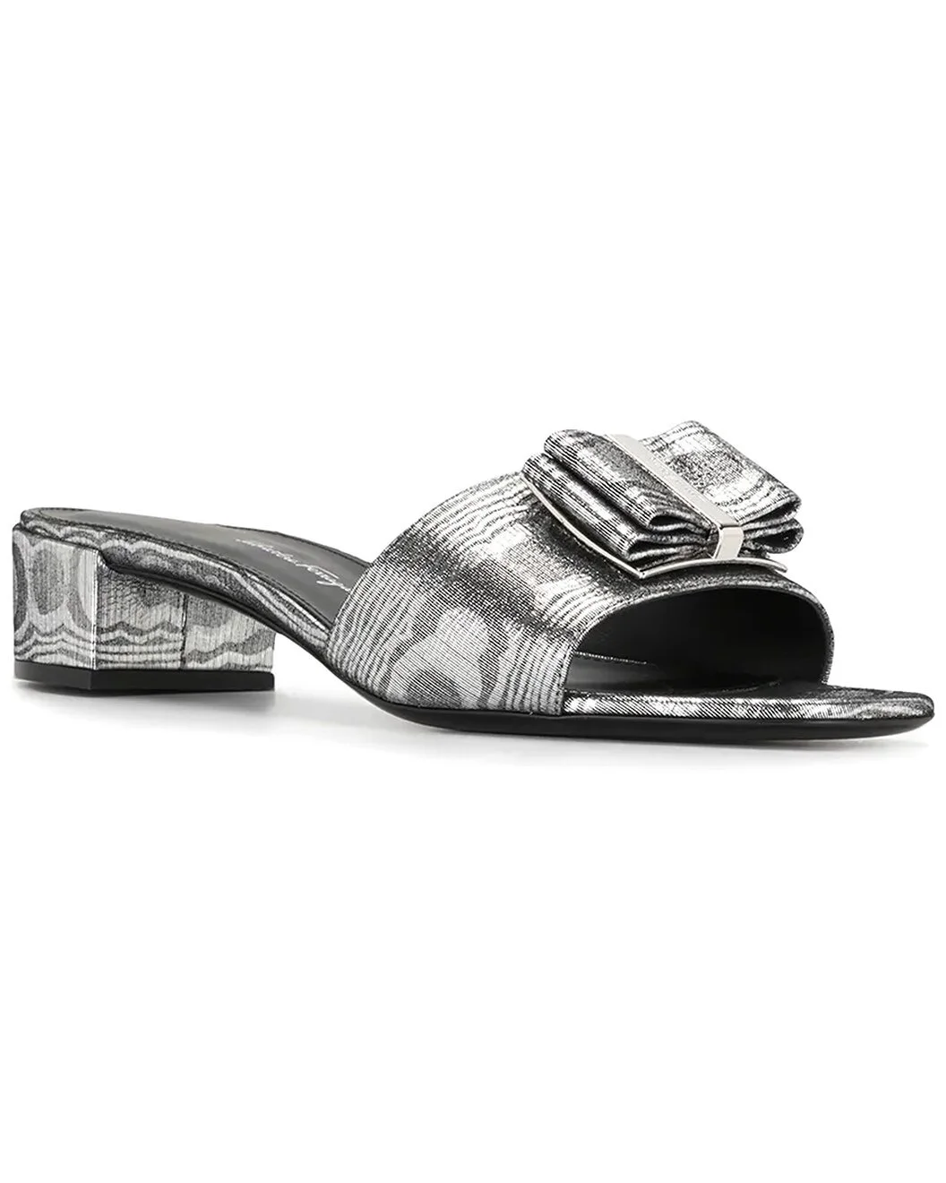 - About the brand: The Gancini, The Vara, and all the icons in-between. - Made in Italy - Bow 30mm Leather Slide in silver leather - Buckle closure - Leather sole - 1in heel - Our products are 100% genuine. In some cases we purchase merchandise from trusted independent suppliers and not directly from the brand owner. In all cases we stand by the authenticity of every product sold on our site.