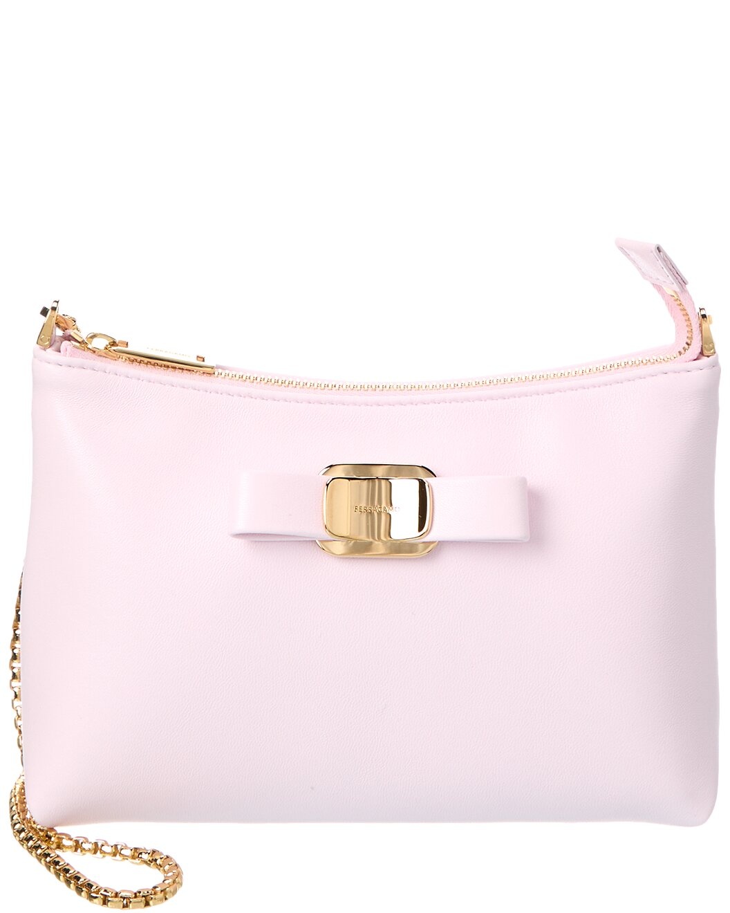 - About the brand: The Gancini, The Vara, and all the icons in-between. - Made in Italy - Leather Shoulder Bag in cotton candy leather and gold-tone hardware with leather Vara bow accent - Interior design details: leather lining, card slots - Measures 7.5in wide x 5in high x 3in deep - Shoulder strap drops 23in - Zipper closure - Please note: All measurements were taken by hand and are approximate; slight variations may occur. - Our products are 100% genuine. In some cases we purchase merchandise from trusted independent suppliers and not directly from the brand owner. In all cases we stand by the authenticity of every product sold on our site.