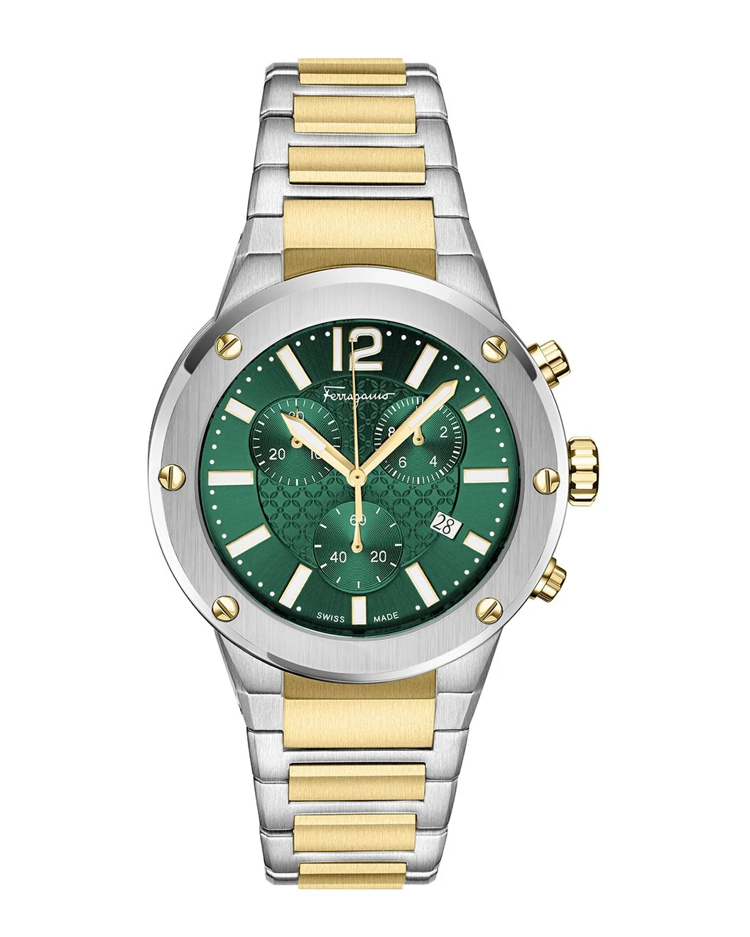 - About the brand: The Gancini, The Vara, and all the icons in-between. - Chronograph Date Quartz chronograph movement - Gold/Silver Recycled Stainless Steel bracelet - Deployant clasp - Sapphire crystal - Push-Pull crown - Green dial - Date display - Case: 42MM x 11.4 - Bracelet/strap: 15mm wide x 191.7mm long - 18 inches - Water-resistant up to 5 meters - Manufacturer's limited warranty - Date Window/Sub Dials - Made in Switzerland - The Watch Size Guide - Our products are 100% genuine. In some cases we purchase merchandise from trusted independent suppliers and not directly from the brand owner. In all cases we stand by the authenticity of every product sold on our site.