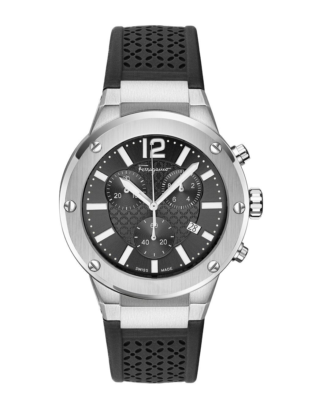 - About the brand: The Gancini, The Vara, and all the icons in-between. - Chronograph Date Quartz chronograph movement - Black Silicone strap - Deployant clasp - Stainless Steel bezel - Stainless Steel case - Sapphire crystal - Push-pull crown - Black dial - Date display - Case: 42mm x 11.4mm - Bracelet/strap: 15mm wide x 110 x 70mm long - Water-resistant up to 50 meters - Manufacturer's limited warranty - Swiss Made - The Watch Size Guide - Our products are 100% genuine. In some cases we purchase merchandise from trusted independent suppliers and not directly from the brand owner. In all cases we stand by the authenticity of every product sold on our site.