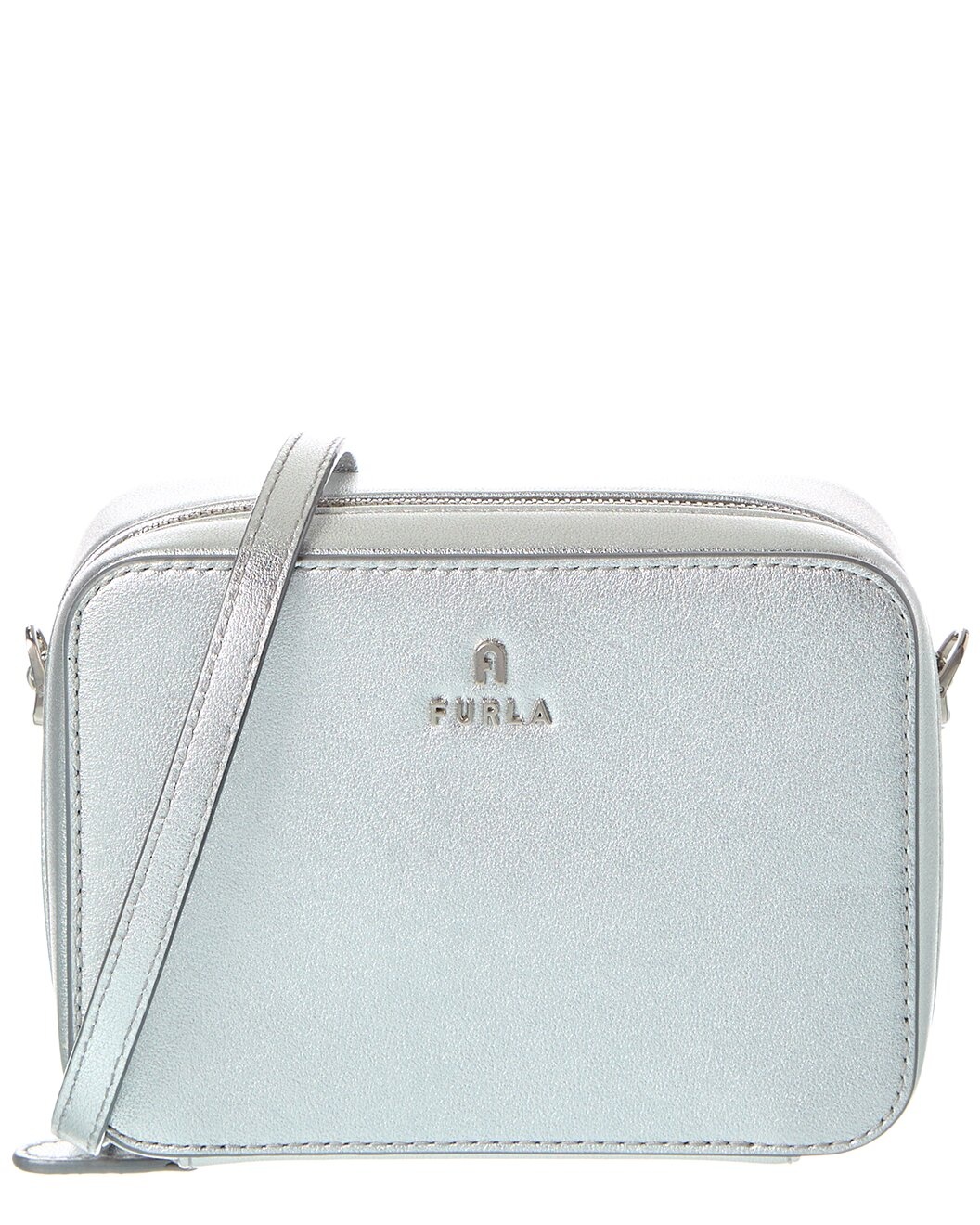 - About the brand: Classic elegance crafted with quality. - Camelia Mini Leather Camera Case in silver leather and palladium-tone hardware with Furla and arch logo punched on the front - Interior design details: four inner credit card and ID slots - Measures 5.85in wide x 4.29in high x 2.145in deep - Shoulder strap drops 21.45in - Zipper closure - Imported - Please note: All measurements were taken by hand and are approximate; slight variations may occur.