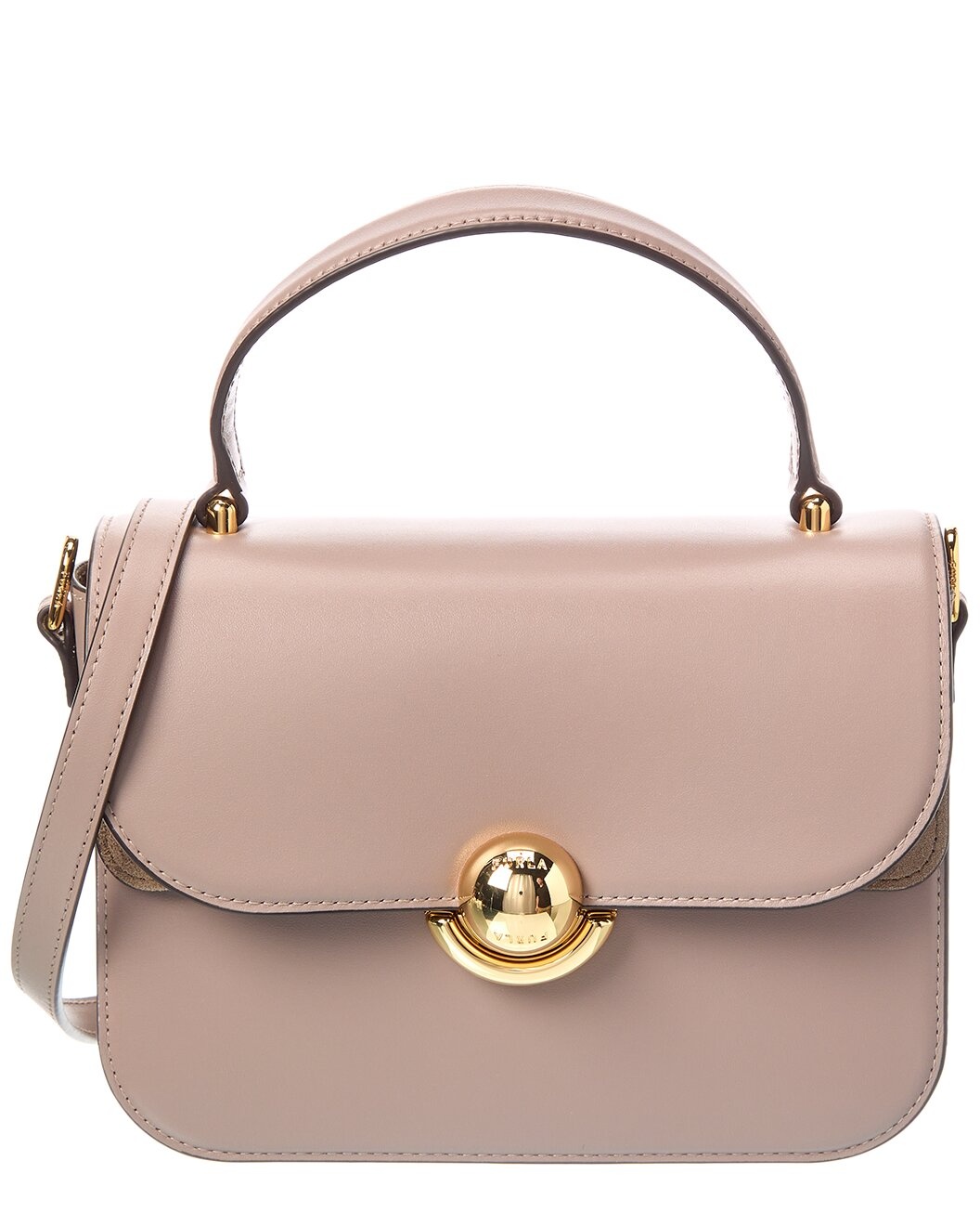 - About the brand: Classic elegance crafted with quality. - Color/material: mauve leather - Design details: bronze-tone hardware, the front flap is embellished with the sfera closure, an iconic signature of the Furla brand, and the matching handle is also complemented by an adjustable and detachable shoulder strap. - Interior design details: open inside pocket; inside zip pocket - Measures 8.6614in wide x 5.9055in high x 3.937in deep - Top handle drops 3.5433in - Shoulder strap drops 20.8661in - Fold-over flap closure - Imported - Please note: All measurements were taken by hand and are approximate; slight variations may occur.