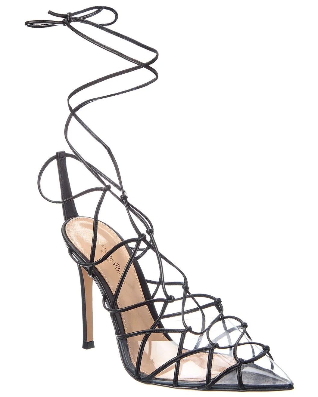 - About the brand: Effortless and wearable Italian chic. - Please note: Size selections are European. For US conversions, please reference size chart. - Made in Italy - Miria 105 Leather & Vinyl Pump in black leather and transparent vinyl with pointy-toe and lace-up detailing - Self-tie ankle wrap closure - Lightly padded leather insole - Smooth leather sole - 4in heel - Please note: All measurements are approximate and were taken from a size 37; slight variations may occur. - Our products are 100% genuine. In some cases we purchase merchandise from trusted independent suppliers and not directly from the brand owner. In all cases we stand by the authenticity of every product sold on our site. - WARNING: - CA Residents - Prop 65