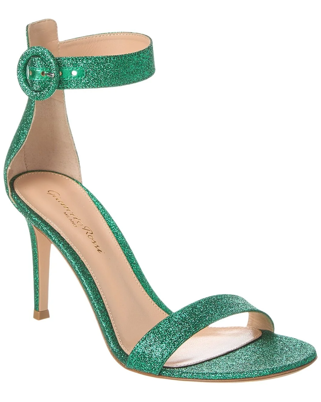 - About the brand: Effortless and wearable Italian chic. - Please note: Size selections are European. For US conversions, please reference size chart. - Made in Italy - Portofino 85 Glitter Sandal in green glitter and silver-tone hardware with round buckle - Adjustable ankle strap with buckle closure - Lightly padded leather insole - Smooth leather sole - 3.5in heel - Please note: All measurements are approximate and were taken from a size 37; slight variations may occur. - Our products are 100% genuine. In some cases we purchase merchandise from trusted independent suppliers and not directly from the brand owner. In all cases we stand by the authenticity of every product sold on our site.