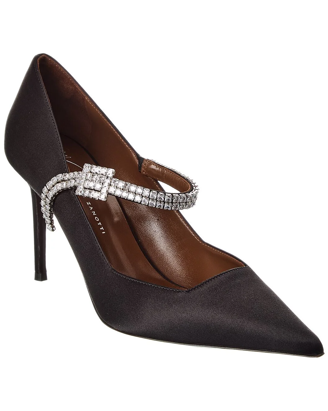 - About the brand: Glamourous & creative footwear and accessories with edge. - Please note: Size selections are European. For US conversions, please reference size chart. - Based on feedback from Members, this brand typically runs small. We suggest sizing up a half size for most styles. - Made in Italy - Raquel 85 Satin Pump in black satin and silver-tone hardware with crystal-embellished strap - Elasticized slip-on style - Lightly padded leather insole - Smooth leather sole - 3.5in heel - Please note: All measurements are approximate and were taken from a size 37; slight variations may occur.