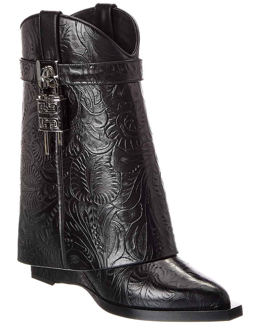 - About the brand: Elegance. Sophistication. Finesse. - Please note: Size selections are European. For US conversions, please reference size chart. - Made in Italy - Shark Lock Leather Cowboy Boot in black embossed leather and silver-tone hardware with fold-over cuff and padlock logo charm - Lightly padded leather insole - Smooth leather sole - 2.5in heel - 8in shaft - 13in boot circumference - Please note: All measurements are approximate and were taken from a size 37; slight variations may occur. - The Boot Size Guide - Our products are 100% genuine. In some cases we purchase merchandise from trusted independent suppliers and not directly from the brand owner. In all cases we stand by the authenticity of every product sold on our site.