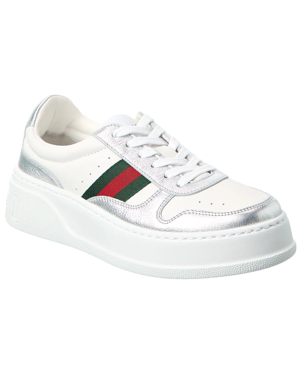 - About the brand: Eclectic and coveted. Italian luxury redefined. - Please note: Size selections are European. For US conversions, please reference size chart. - Based on feedback from Members, this item typically runs large. We suggest sizing down. - Made in Italy - Chunky Leather Sneaker in white and silver leather with red and green signature webbing stripe - Lace-up closure - Lightly padded leather insole - Rubber sole with traction - Our products are 100% genuine. In some cases we purchase merchandise from trusted independent suppliers and not directly from the brand owner. In all cases we stand by the authenticity of every product sold on our site.