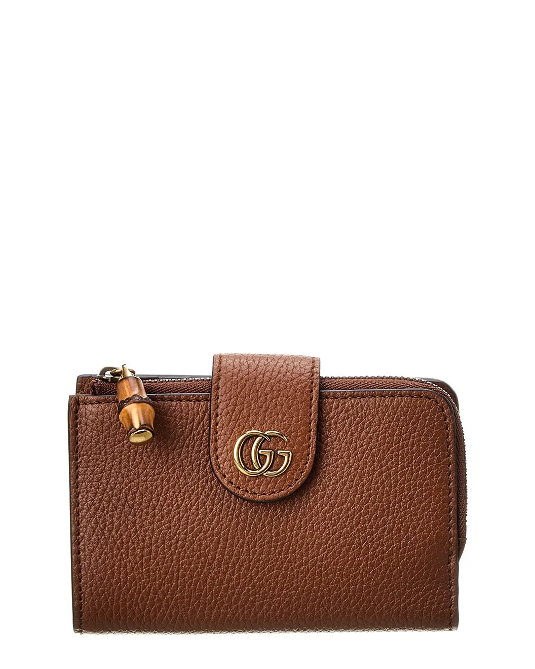 - About the brand: Eclectic and coveted. Italian luxury redefined. - Made in Italy - Double G Medium Leather Card Case in brown leather and light fine gold hardware with interlocking G logo accent, bamboo zipper pull and zippered pocket - Interior design details: leather and fabric lining, card slots, bill compartment - Measures 6.75in wide x 3.3in high x 1in deep - Fold-over flap with snap closure - Please note: All measurements were taken by hand and are approximate; slight variations may occur. - Our products are 100% genuine. In some cases we purchase merchandise from trusted independent suppliers and not directly from the brand owner. In all cases we stand by the authenticity of every product sold on our site.