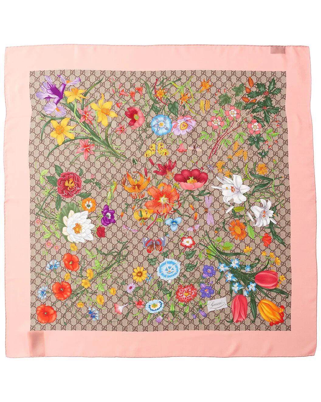 - Guaranteed for Mother's Day. Delivery restrictions apply. - See disclaimer. - About the brand: Eclectic and coveted. Italian luxury redefined. - GG Flora Print Silk Scarf in pink - Measures 35.4in long x 35.4in wide - 100% silk - Dry clean only - Made in Italy - Please note: All measurements were taken by hand and are approximate; slight variations may occur. - Our products are 100% genuine. In some cases we purchase merchandise from trusted independent suppliers and not directly from the brand owner. In all cases we stand by the authenticity of every product sold on our site.