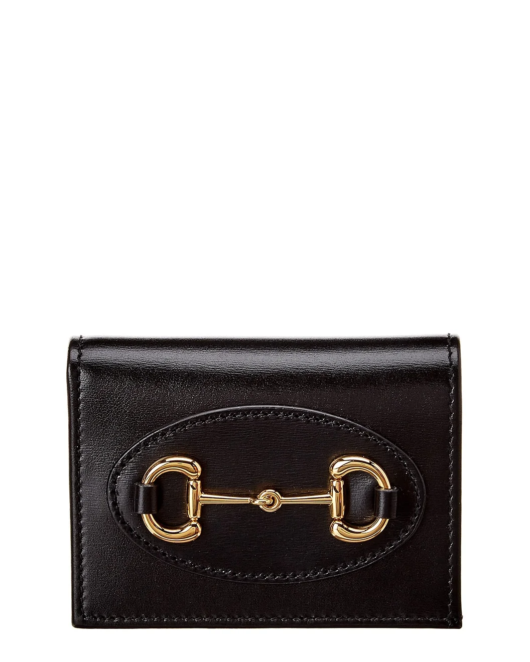 - About the brand: Eclectic and coveted. Italian luxury redefined. - Made in Italy - Horsebit 1955 Leather Card Case in black leather with light fine gold hardware and horsebit detail - Interior design details: leather and fabric lining, card slots, zippered pocket - Measures 4.3in wide x 3.3in high x 1in deep - Fold-over flap with snap closure - Please note: All measurements were taken by hand and are approximate; slight variations may occur. - Our products are 100% genuine. In some cases we purchase merchandise from trusted independent suppliers and not directly from the brand owner. In all cases we stand by the authenticity of every product sold on our site.