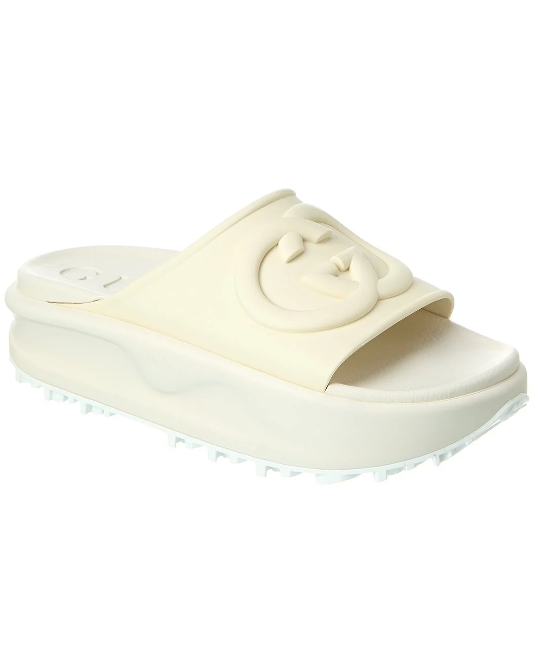- About the brand: Eclectic and coveted. Italian luxury redefined. - Please note: Size selections are European. For US conversions, please reference size chart. - Made in Italy - Interlocking G Rubber Slide in white rubber with interlocking G logo accent - Smooth insole - Rubber sole with traction - 2in platform - Please note: All measurements are approximate and were taken from a size 37; slight variations may occur. - Our products are 100% genuine. In some cases we purchase merchandise from trusted independent suppliers and not directly from the brand owner. In all cases we stand by the authenticity of every product sold on our site.