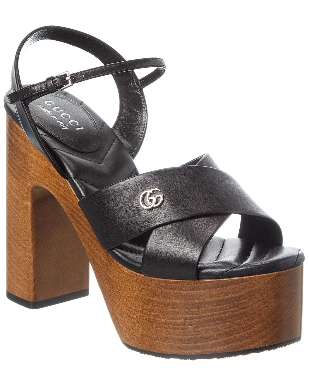 - About the brand: Eclectic and coveted. Italian luxury redefined. - Please note: Size selections are European. For US conversions, please reference size chart. - Made in Italy - Leather Platform Sandal in black leather and dark silver hardware with interlocking G logo accent and wooden platform - Adjustable ankle strap with buckle closure - Lightly padded leather insole - Smooth leather sole - 5in heel - 2in platform - Please note: All measurements are approximate and were taken from a size 37; slight variations may occur. - Our products are 100% genuine. In some cases we purchase merchandise from trusted independent suppliers and not directly from the brand owner. In all cases we stand by the authenticity of every product sold on our site.