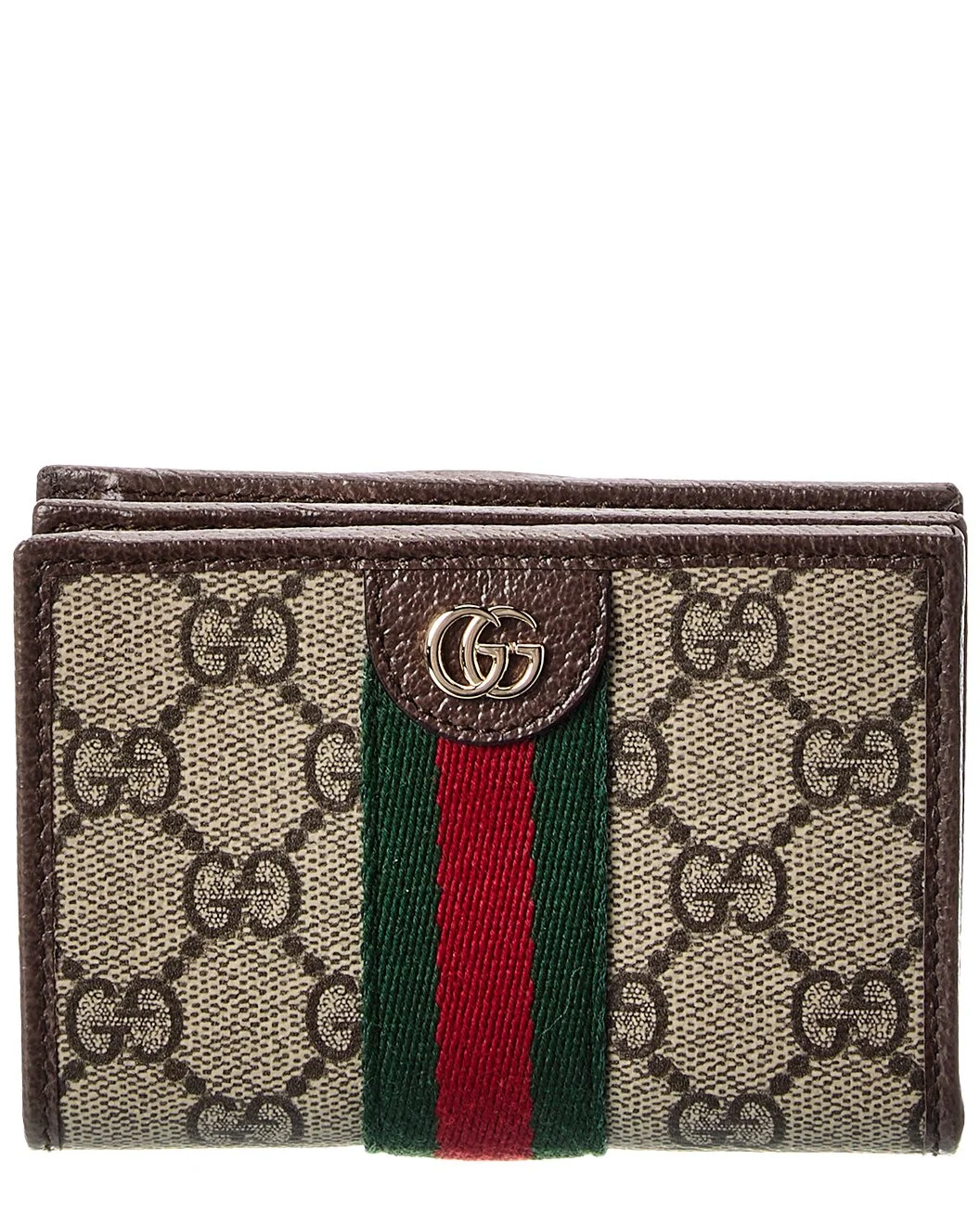 - About the brand: Eclectic and coveted. Italian luxury redefined. - Made in Italy - Ophidia Small GG Supreme Canvas & Leather Card Case in GG supreme canvas and brown leather and light fine gold hardware with interlocking G logo accent and red and green signature webbing stripe - Interior design details: leather lining, card slots - Measures 4.5in wide x 3in high x 1in deep - Fold-over flap with snap closure - Please note: All measurements were taken by hand and are approximate; slight variations may occur. - Our products are 100% genuine. In some cases we purchase merchandise from trusted independent suppliers and not directly from the brand owner. In all cases we stand by the authenticity of every product sold on our site.