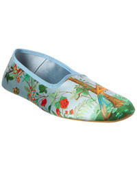 - About the brand: Eclectic and coveted. Italian luxury redefined. - Please note: Size selections are UK. For US conversions, please reference size chart. - Made in Italy - Satin Slipper in blue printed satin with grosgrain trim - Lightly padded insole - Smooth leather sole - Our products are 100% genuine. In some cases we purchase merchandise from trusted independent suppliers and not directly from the brand owner. In all cases we stand by the authenticity of every product sold on our site.