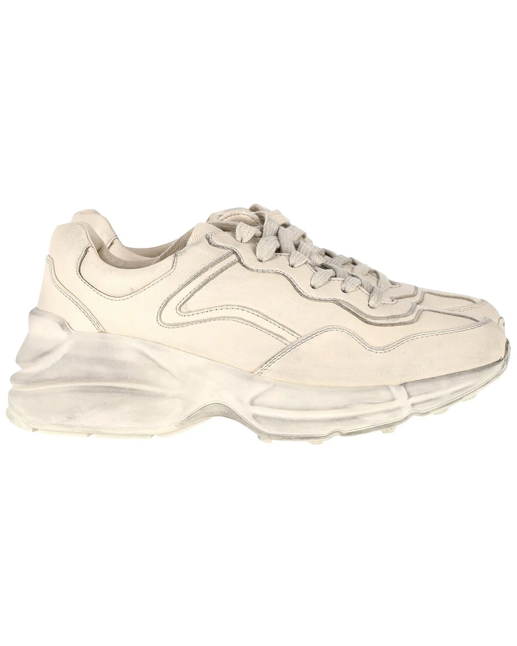 - About the brand: Eclectic and coveted. Italian luxury redefined. - This is an authentic, pre-loved piece. This item is in very good condition and shows light signs of wear. This item shows lightly used but very well maintained, may show minor signs of wear, scratches , worn corners, minor interior wear. - For more information on condition, please see our condition guide at the bottom - Color/material: white leather - Design details: Luxury with an Edge: Embrace luxury with an edge in the Gucci Distressed Rhyton Sneakers in White Leather. The high-quality leather and distressed finish create a unique juxtaposition of elegance and ruggedness. These sneakers are ideal for individuals who seek a luxurious yet effortlessly laid-back footwear option that makes a statement. - Accompanied by box and dust bag - 2in heel - 11.0in insole length - The Pre-Loved Condition Guide - Our products are 100% genuine. In some cases we purchase merchandise from trusted independent suppliers and not directly from the brand owner. In all cases we stand by the authenticity of every product sold on our site.