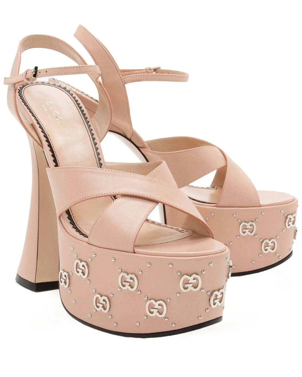 - About the brand: Eclectic and coveted. Italian luxury redefined. - This is an authentic, pre-loved piece. This item is in excellent condition, but may show slight signs of wear. This item shows unused or used once, but as good as new. no sign of wear. - For more information on condition, please see our condition guide at the bottom - Color/material: pink leather - Design details: The Italian fashion house of continues to reinterpret its rich heritage under current Creative Director Alessandro Michele (2015). Maintaining a balance between historical reference and contemporary eclectic flare, the brand€™s signature double ga€ remains iconic. has been recognized as a worldwide leader in the luxury goods market for 90 years. Condition Notes: Light creasing to upper strap bases. Please note: shoes typically run 1 full size smaller. All sizing is dependent of shoe style. Size: 9Heel: 6.5" (165mm)Platform: 2.25" (55mm)Width: Regular Type of Material: Leather Color: Pink Toe: Open Outsole: Leather Insole: Padded leather Origin: Italy Includes: Dust Bag, Box Hardware: Silver Tone Heel Style: Chunky Measurements: strap length: 0 mm handle drop: 0 mm - Please note: All measurements were taken by hand and are approximate; slight variations may occur. - Available only in Women's size 9 - The Pre-Loved Condition Guide - Our products are 100% genuine. In some cases we purchase merchandise from trusted independent suppliers and not directly from the brand owner. In all cases we stand by the authenticity of every product sold on our site.