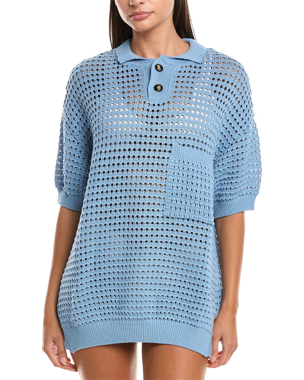- Color/pattern: celeste blue - Approximately 25in from shoulder to hem - Model is 5'9 and is wearing a size small. Measurements may vary slightly by size. - Design details: open knit, spread collar, chest pocket and ribbed trim - Button placket - 50% cotton, 50% acrylic - Hand wash - Imported