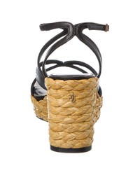 - About the brand: Born in London in the early 90's, Jimmy Choo was one of the first luxury brands to bring shoes and handbags to the red carpet. A playful sense of glamour and exceptional Italian craftsmanship separate Jimmy Choo from the rest, in Hollywood and beyond. - Please note: Size selections are European. For US conversions, please reference size chart. - Based on feedback from Members, this brand typically runs small. We suggest sizing up a half size for most styles. - Made in Spain - Ayla 85 Leather Wedge Sandal in black leather and gold-tone hardware with raffia wedge - Adjustable ankle strap with buckle closure - Lightly padded leather insole - Smooth leather sole - 3.5in heel - 1in platform - Please note: All measurements are approximate and were taken from a size 36; slight variations may occur. - Our products are 100% genuine. In some cases we purchase merchandise from trusted independent suppliers and not directly from the brand owner. In all cases we stand by the authenticity of every product sold on our site.