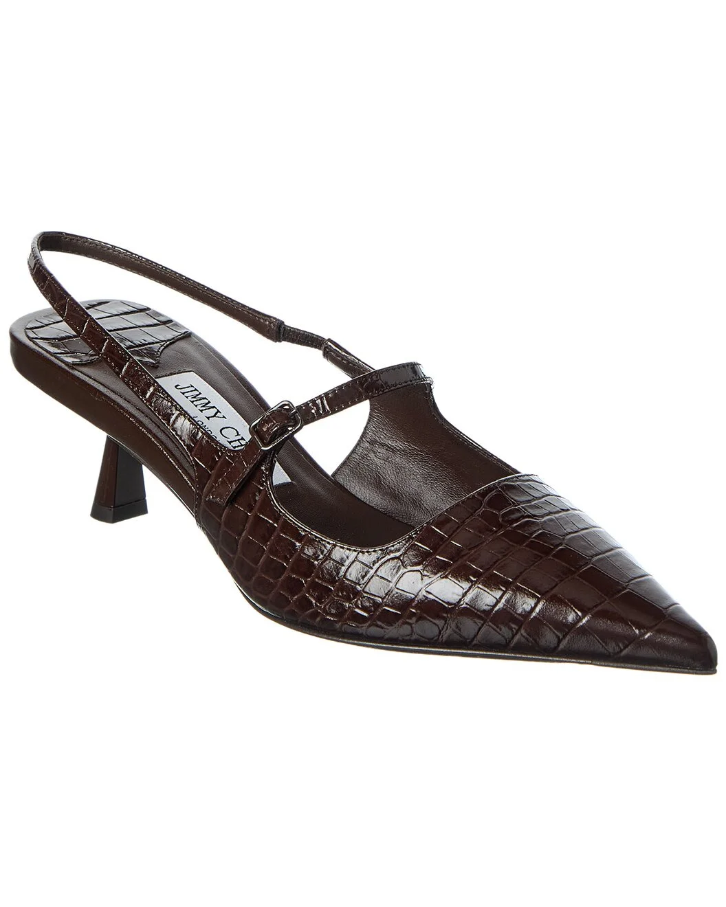 - About the brand: Born in London in the early 90's, Jimmy Choo was one of the first luxury brands to bring shoes and handbags to the red carpet. A playful sense of glamour and exceptional Italian craftsmanship separate Jimmy Choo from the rest, in Hollywood and beyond. - Please note: Size selections are European. For US conversions, please reference size chart. - Based on feedback from Members, this brand typically runs small. We suggest sizing up a half size for most styles. - Made in Italy - Didi 45 Croc-Embossed Leather Slingback Pump in chocolate croc-embossed leather and silver-tone hardware with pointy-toe - Buckle closure - Lightly padded leather insole - Smooth leather sole - 2in heel - Please note: All measurements are approximate and were taken from a size 37; slight variations may occur. - Our products are 100% genuine. In some cases we purchase merchandise from trusted independent suppliers and not directly from the brand owner. In all cases we stand by the authenticity of every product sold on our site.