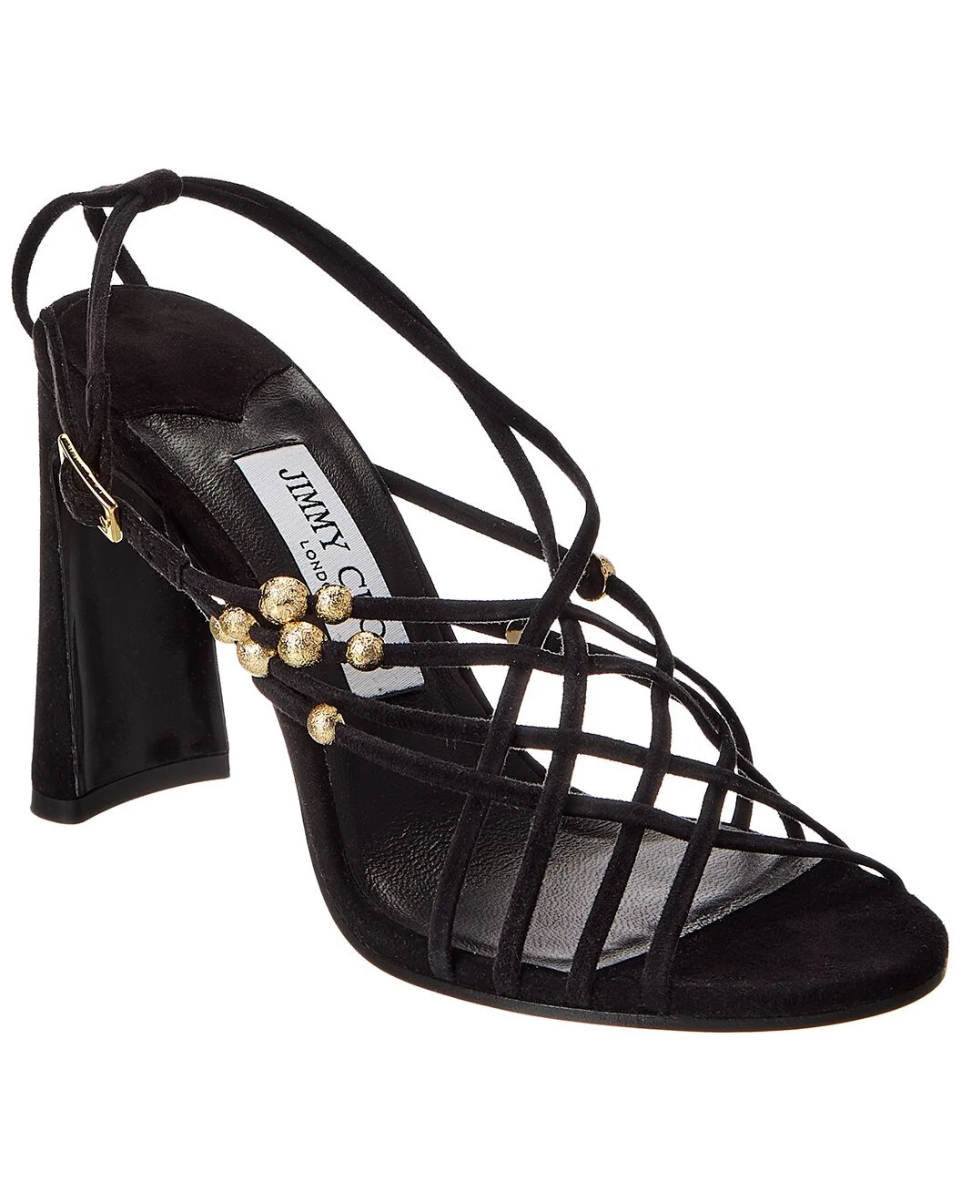 - About the brand: Born in London in the early 90's, Jimmy Choo was one of the first luxury brands to bring shoes and handbags to the red carpet. A playful sense of glamour and exceptional Italian craftsmanship separate Jimmy Choo from the rest, in Hollywood and beyond. - Please note: Size selections are European. For US conversions, please reference size chart. - Based on feedback from Members, this brand typically runs small. We suggest sizing up a half size for most styles. - Made in Italy - Felice 95 Suede Sandal in black suede and gold-tone hardware with caged straps - Adjustable ankle strap with buckle closure - Lightly padded leather insole - Smooth leather sole - 3.5in heel - Please note: All measurements are approximate and were taken from a size 37; slight variations may occur. - Our products are 100% genuine. In some cases we purchase merchandise from trusted independent suppliers and not directly from the brand owner. In all cases we stand by the authenticity of every product sold on our site.