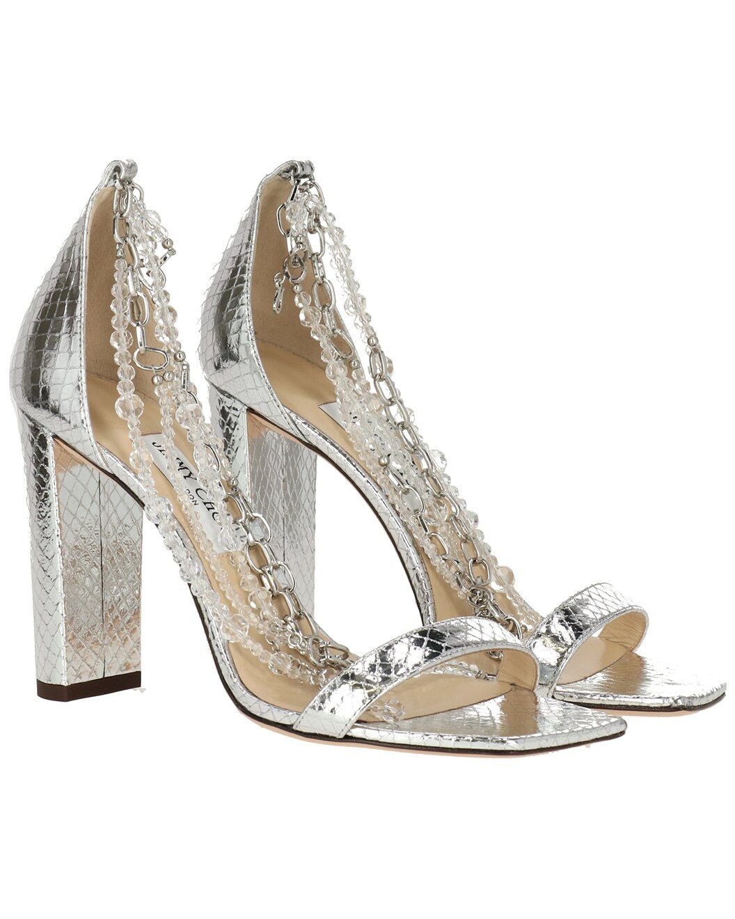 - About the brand: Born in London in the early 90's, Jimmy Choo was one of the first luxury brands to bring shoes and handbags to the red carpet. A playful sense of glamour and exceptional Italian craftsmanship separate Jimmy Choo from the rest, in Hollywood and beyond. - Based on feedback from Members, this brand typically runs small. We suggest sizing up a half size for most styles. - Made in Italy - Neena 100 Leather Sandal in silver/crystal/silver leather and silver-tone hardware with decorative chain ankle strap, glass beads embellishment - Buckle closure - Smooth insole - Leather sole - 4in heel - Our products are 100% genuine. In some cases we purchase merchandise from trusted independent suppliers and not directly from the brand owner. In all cases we stand by the authenticity of every product sold on our site.
