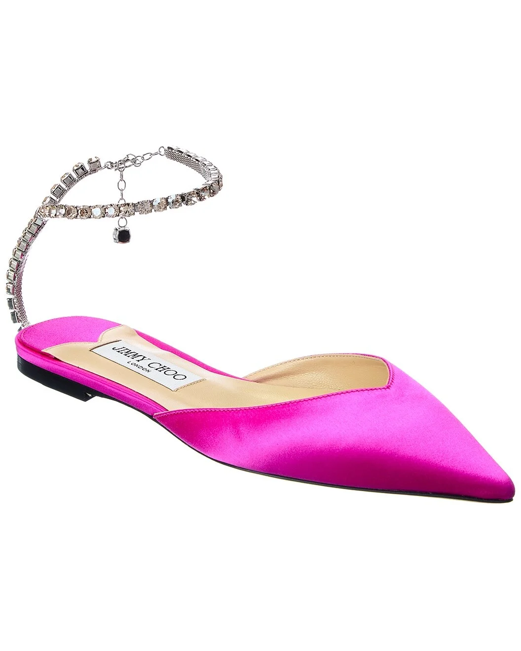 - About the brand: Born in London in the early 90's, Jimmy Choo was one of the first luxury brands to bring shoes and handbags to the red carpet. A playful sense of glamour and exceptional Italian craftsmanship separate Jimmy Choo from the rest, in Hollywood and beyond. - Please note: Size selections are European. For US conversions, please reference size chart. - Based on feedback from Members, this brand typically runs small. We suggest sizing up a half size for most styles. - Made in Italy - Saeda Satin Flat in fuchsia satin and silver-tone hardware with crystal ankle strap - Hook closure - Lightly padded leather insole - Smooth leather sole - Our products are 100% genuine. In some cases we purchase merchandise from trusted independent suppliers and not directly from the brand owner. In all cases we stand by the authenticity of every product sold on our site.