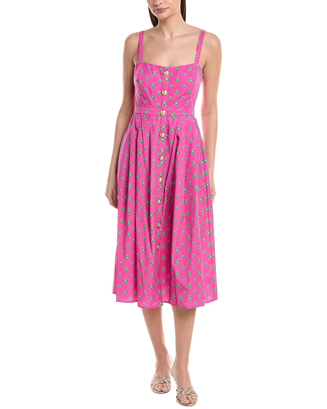 - Guaranteed for Easter. Delivery restrictions apply. - See disclaimer. - Color/pattern: southwestern geo - Approximately 46in from shoulder to hem - Model is 5'9 and is wearing a size 4. Measurements may vary slightly by size. - Design details: square neck, button accents, and adjustable shoulder straps - Center back zip with hook-and-eye closure - 62% lyocell, 38% cotton - Lining: 100% cotton - Machine wash - Imported