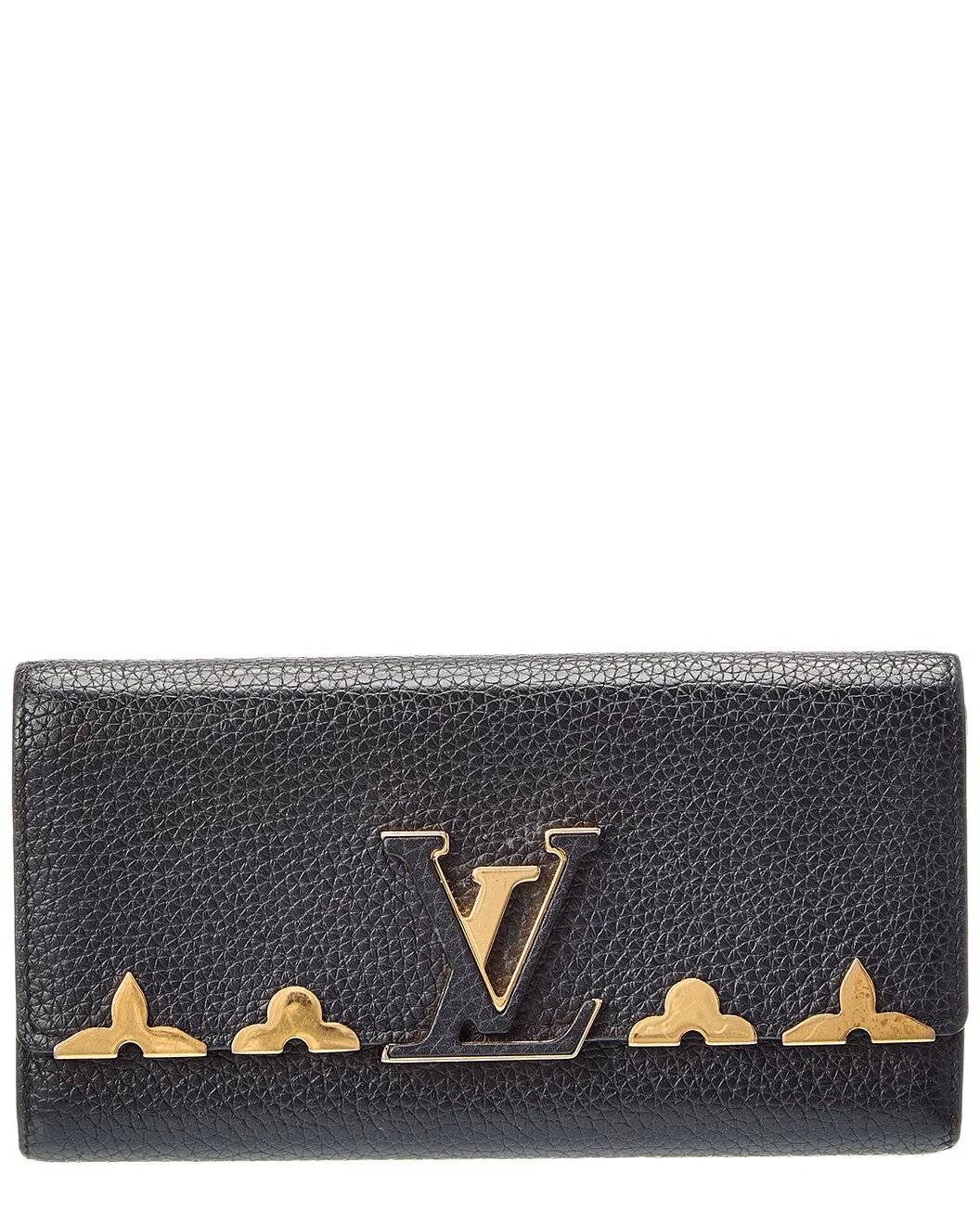 - About the brand: Exceptional luxury staples, crafted to perfection. - This is an authentic, pre-loved piece. This item is in excellent condition, but may show slight signs of wear. This item shows the item is in excellent vintage condition. minor discolorations and scratches may be present in less obvious areas such as corners, but there are no major scuffs, holes or tears. - For more information on condition, please see our condition guide at the bottom - Embellished Capucines Long Wallet in Black LV Taurillon Leather - Measurements: 4.3in long x 8in high; 1in strap - Please note: All measurements were taken by hand and are approximate; slight variations may occur. - Accompanied by dust bag - The Pre-Loved Condition Guide - Our products are 100% genuine. In some cases we purchase merchandise from trusted independent suppliers and not directly from the brand owner. In all cases we stand by the authenticity of every product sold on our site.