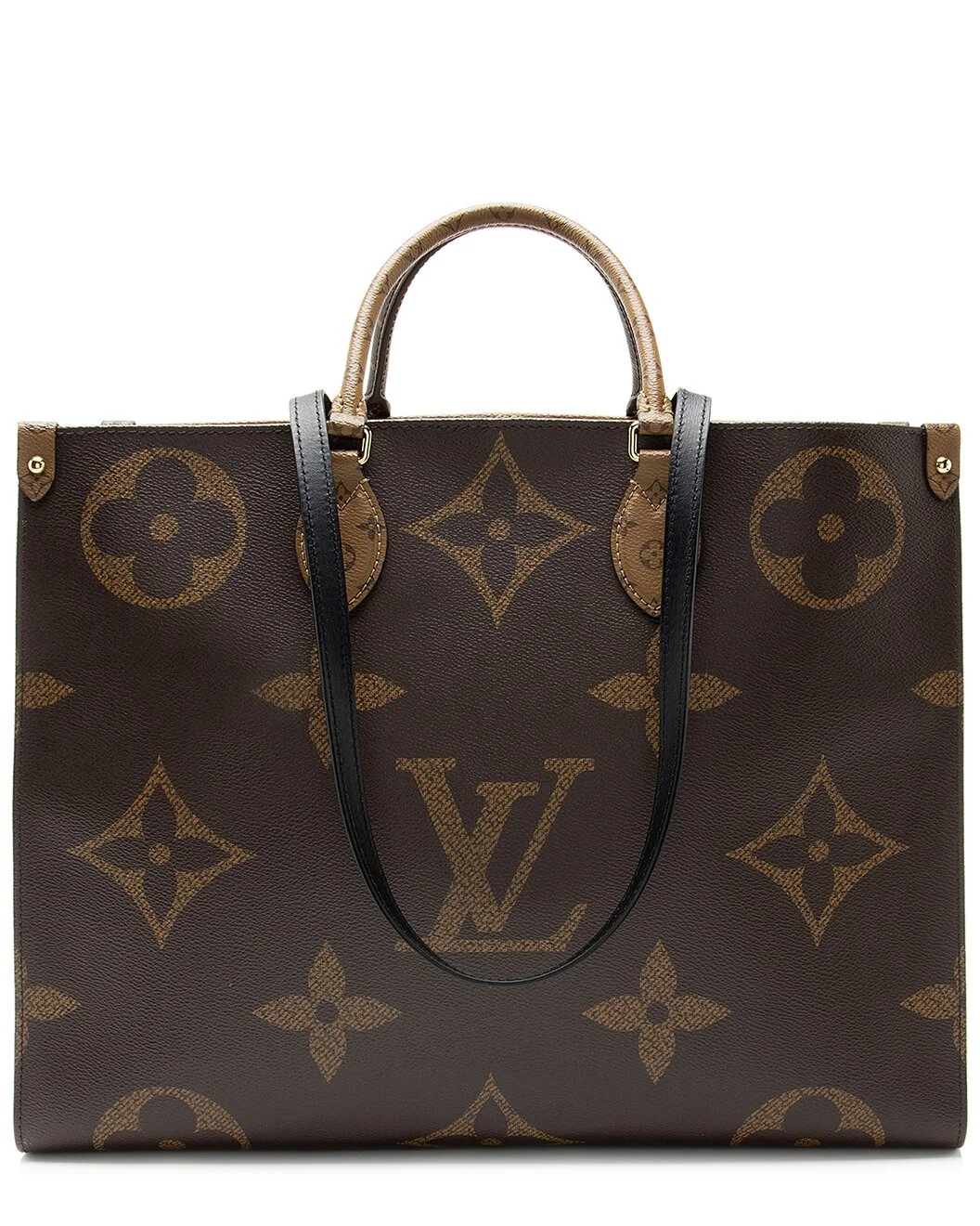 - About the brand: Exceptional luxury staples, crafted to perfection. - This is an authentic, pre-loved piece. This item is in excellent condition, but may show slight signs of wear. This item shows minor marks and scuffs to exterior corners. minor fraying to interior top edge of coated canvas. minor marks throughout interior. interior odor. - For more information on condition, please see our condition guide at the bottom - Onthego GM in Brown Giant Monogram Coated Canvas with red fine textile lining and gold-tone brass hardware - Pockets: three interior - Measurements: 16.25in long x 6.5in wide x 12.5in high; 5in handle; 12in strap - Please note: All measurements were taken by hand and are approximate; slight variations may occur. - Accompanied by dust bag - Snap hook closure - The Pre-Loved Condition Guide - Our products are 100% genuine. In some cases we purchase merchandise from trusted independent suppliers and not directly from the brand owner. In all cases we stand by the authenticity of every product sold on our site.