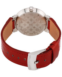 - About the brand: Exceptional luxury staples, crafted to perfection. - Circa 2000s - This is an authentic, pre-loved Louis Vuitton piece. It's possible that there may be some gentle wear. - Quartz movement - Red leather strap - Pin buckle clasp - Stainless Steel bezel encrusted with Diamond - Stainless Steel case - Sapphire crystal - Push down crown - Mother Of Pearl dial - Diamond hour markers - Date display - Case: 33mm - Bracelet/strap: 18mm wide x 7in long - Water-resistant up to 50 meters - Manufacturer's limited warranty - It is customary to treat most gemstones to achieve enhanced color and durability. Some of these treatments may not be permanent, and may require special care. - Independent Appraisal and Generic Box - The Watch Size Guide - Our products are 100% genuine. In some cases we purchase merchandise from trusted independent suppliers and not directly from the brand owner. In all cases we stand by the authenticity of every product sold on our site.
