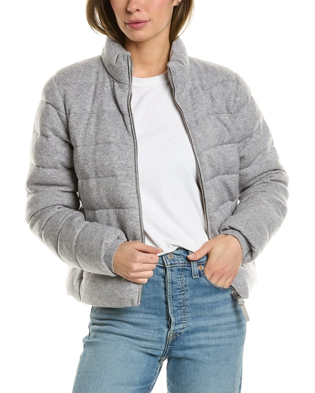 - About the brand: Elevated outerwear. Unique functionality. - Melia Wool & Cashmere-Blend Down Jacket in grey with stand-up collar, two zippered front pockets, and inner rib cuffs - Approximately 22.5in from shoulder to hem - Model is 5'10 and is wearing a size small. Measurements may vary slightly by size. - Zipper closure - Lightweight - Shell: 65% wool, 35% cashmere - Lining: 100% nylon - Fill: 90% goose down, 10% feathers - Dry clean only - Imported