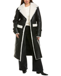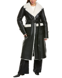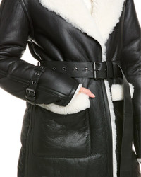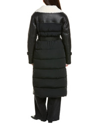 - About the brand: Elevated outerwear. Unique functionality. - Sabreen Leather Coat in black with notched lapel, two front pockets, belted waist, quilted back and belted cuffs - Approximately 48in from shoulder to hem - Model is 5'9 and is wearing a size small. Measurements may vary slightly by size. - Snap front - Heavyweight - Shell 1: Sheepskin leather - Fur: dyed sheepskin (UK) - Shell 2 & Lining: 82% recycled nylon, 18% spandex - Fill: 90% goose down, 10% feathers - Clean by a leather and fur expert - Imported