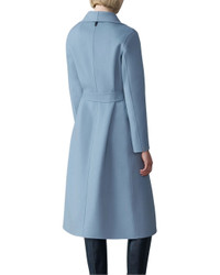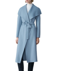 - About the brand: Elevated outerwear. Unique functionality. - Wrap Coat in fog blue with includes fabric belt - Approximately 47in from shoulder to hem - Slip-on styling - Shell: 100% wool - Combo: 100% lamb leather - Dry clean only - Imported