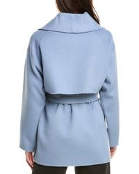 - About the brand: Elevated outerwear. Unique functionality. - Robe jacket in fog blue - Approximately 30in from shoulder to hem - Slip-on styling - Shell: 100% wool - Combo Shell 1: 100% lamb leather - Dry clean only - Imported