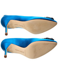 - About the brand: Beautifully feminine, elegant, and iconic. - This is an authentic, pre-loved piece. This item is in very good condition and shows light signs of wear. This item shows worn soles. - For more information on condition, please see our condition guide at the bottom - Please note: Size selections are European. For US conversions, please reference size chart. - Based on feedback from Members, this brand typically runs small. We suggest sizing up a half size for most styles. - Made in Italy - Hangisi 70 Satin Pump in blue satin and silver-tone hardware with crystal-embellished buckle - Lightly padded leather insole - Smooth leather sole - 3in heel - Please note: All measurements are approximate and were taken from a size 37; slight variations may occur. - Our products are 100% genuine. In some cases we purchase merchandise from trusted independent suppliers and not directly from the brand owner. In all cases we stand by the authenticity of every product sold on our site. - The Pre-Loved Condition Guide