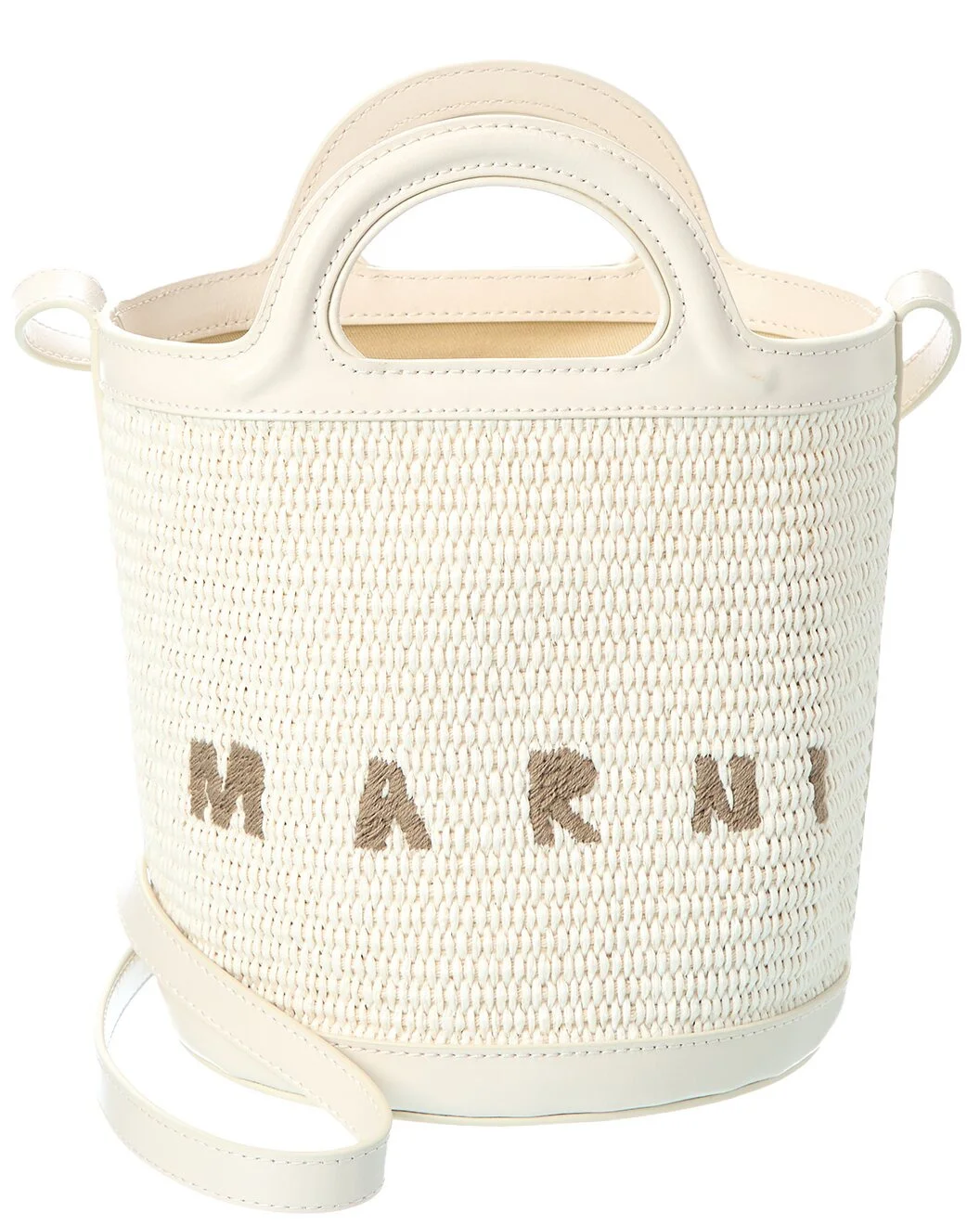 - Made in Italy - Color/material: white raffia-effect fabric and leather - Design details: gold-tone hardware, logo embroidery - Interior design details: canvas lining, zippered pocket - Measures 8.5in wide x 7.5in high x 6.5in deep - Top handles drop 2in - Adjustable shoulder strap drops 27in - Drawstring closure - Please note: All measurements were taken by hand and are approximate; slight variations may occur. - Our products are 100% genuine. In some cases we purchase merchandise from trusted independent suppliers and not directly from the brand owner. In all cases we stand by the authenticity of every product sold on our site.