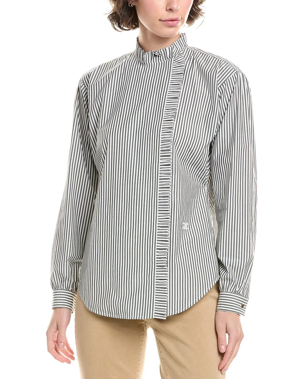 - About the brand: Feminine and sophisticated pieces with an undeniable Italian influence. - Didy Shirt in black stripe with ruffle trim - Approximately 27in from shoulder to hem - Model is 5'9 and is wearing a size 2. Measurements may vary slightly by size. - Button front - 97% cotton, 3% spandex - Dry clean only - Made in Italy