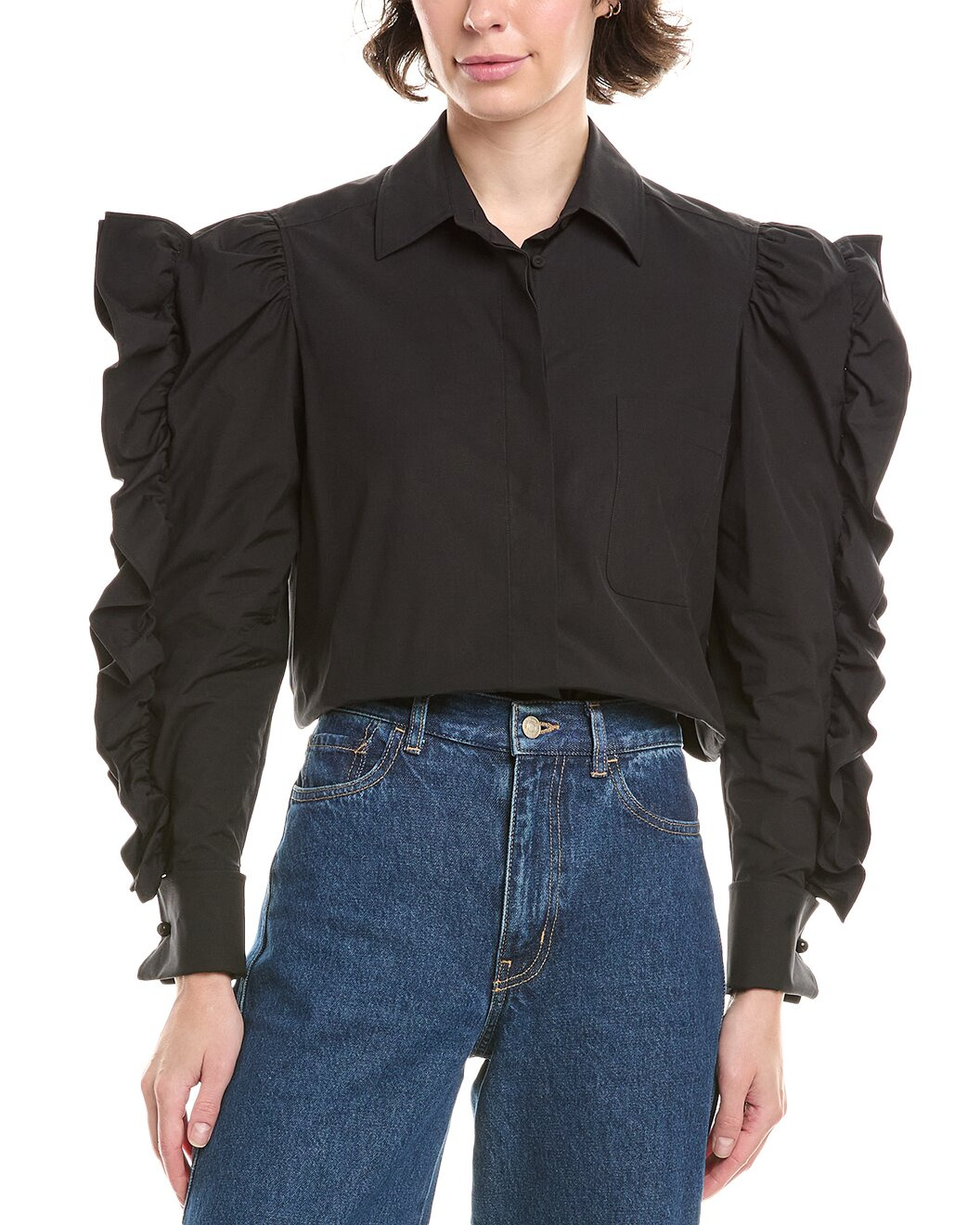 - About the brand: Feminine and sophisticated pieces with an undeniable Italian influence. - Pleiadi Ruffle Puff Sleeve Shirt in black with left chest pocket and high-low shirttail hem - Approximately 27-31in from shoulder to hem - Model is 5'9 and is wearing a size 2. Measurements may vary slightly by size. - Button front - 97% cotton, 3% spandex - Machine wash - Made in Italy